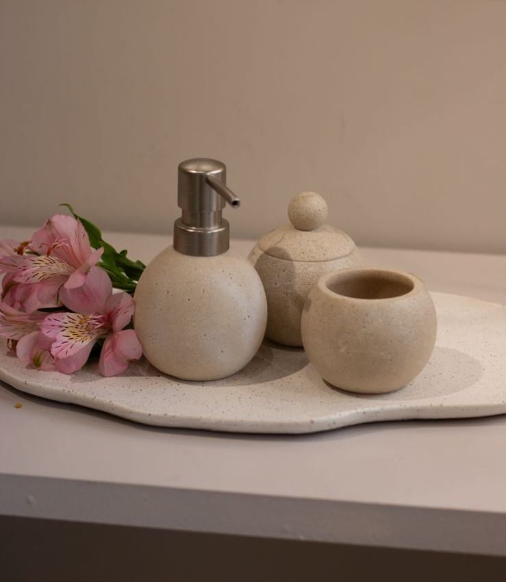 Com esse conjunto composto de porta sabonete, copo e pote com tampa em poliresina bege, seu lavabo ou banheiro ficará muito mais organizado e charmoso.