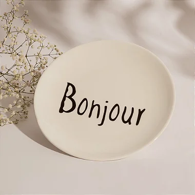 Este prato em porcelana com escrita Bonjour ( Bom dia ) vai transformar seus momentos à mesa, desenvolvido para unir beleza, funcionalidade e afeto em cada detalhe.