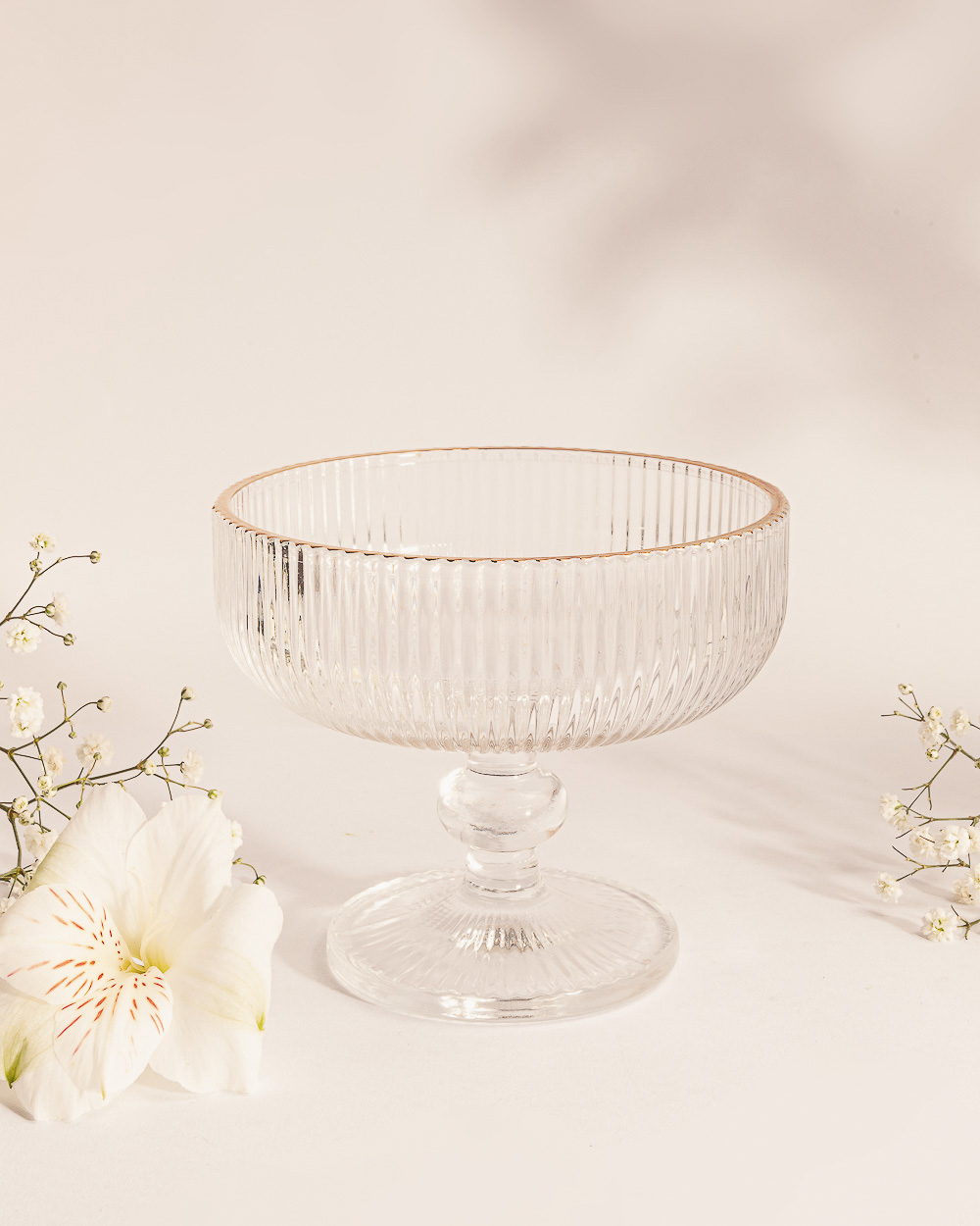 Esta taça de sobremesa possui um design clássico, combinando o cristal ecológico com detalhes dourados que adicionam beleza e delicadeza.